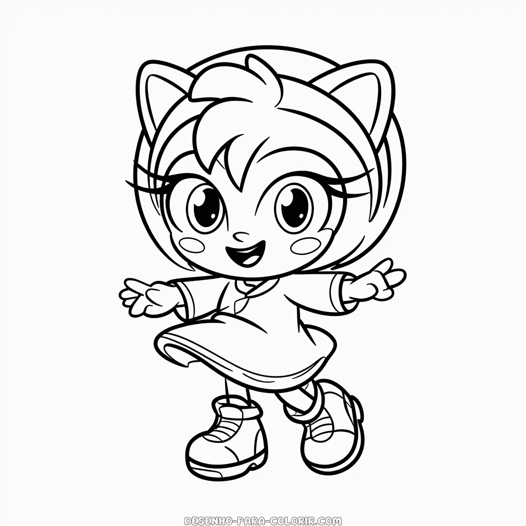 Desenho para colorir grátis de Amy Rose do Sonic, a simpática amiga do famoso ouriço azul em uma pose alegre. Imprima e colora esta figura da Amy Rose, personagem querida do universo Sonic, ideal para crianças. Imagem PNG de alta qualidade, em preto e branco, otimizada para impressão em PDF formato A4.