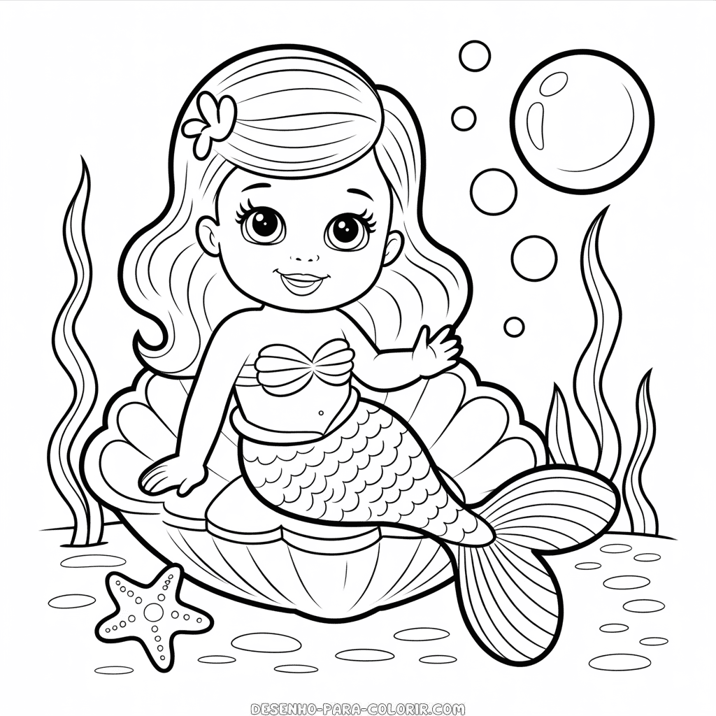 Desenho para colorir grátis de Barbie Bebê Sereia, mostrando a encantadora Barbie em sua versão bebê como uma sereia fofa e mágica. Imprima e colora esta ilustração da Barbie como pequena sereia para crianças. Imagem PNG de alta qualidade, em preto e branco, otimizada para impressão em PDF formato A4.