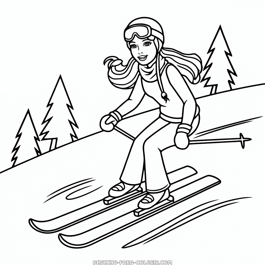 Desenho para colorir grátis de Barbie esquiando, mostrando a famosa boneca enquanto desliza graciosamente pela neve em um dia de inverno. Imprima e colora esta divertida ilustração da Barbie praticando esqui, ideal para crianças que amam essa icônica personagem. Imagem PNG de alta qualidade, em preto e branco, otimizada para impressão em PDF formato A4.