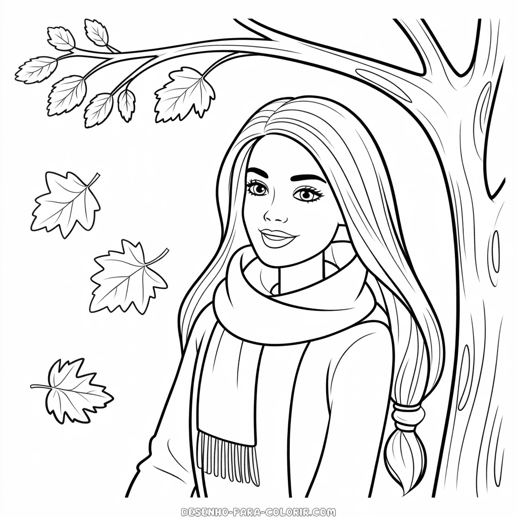 Desenho para colorir grátis de Barbie no Outono, Barbie aproveitando a beleza e as cores da estação outonal. Imprima e colora esta linda ilustração da boneca Barbie em um cenário de folhas caídas, ideal para crianças. Imagem PNG de alta qualidade, em preto e branco, otimizada para impressão em PDF formato A4.