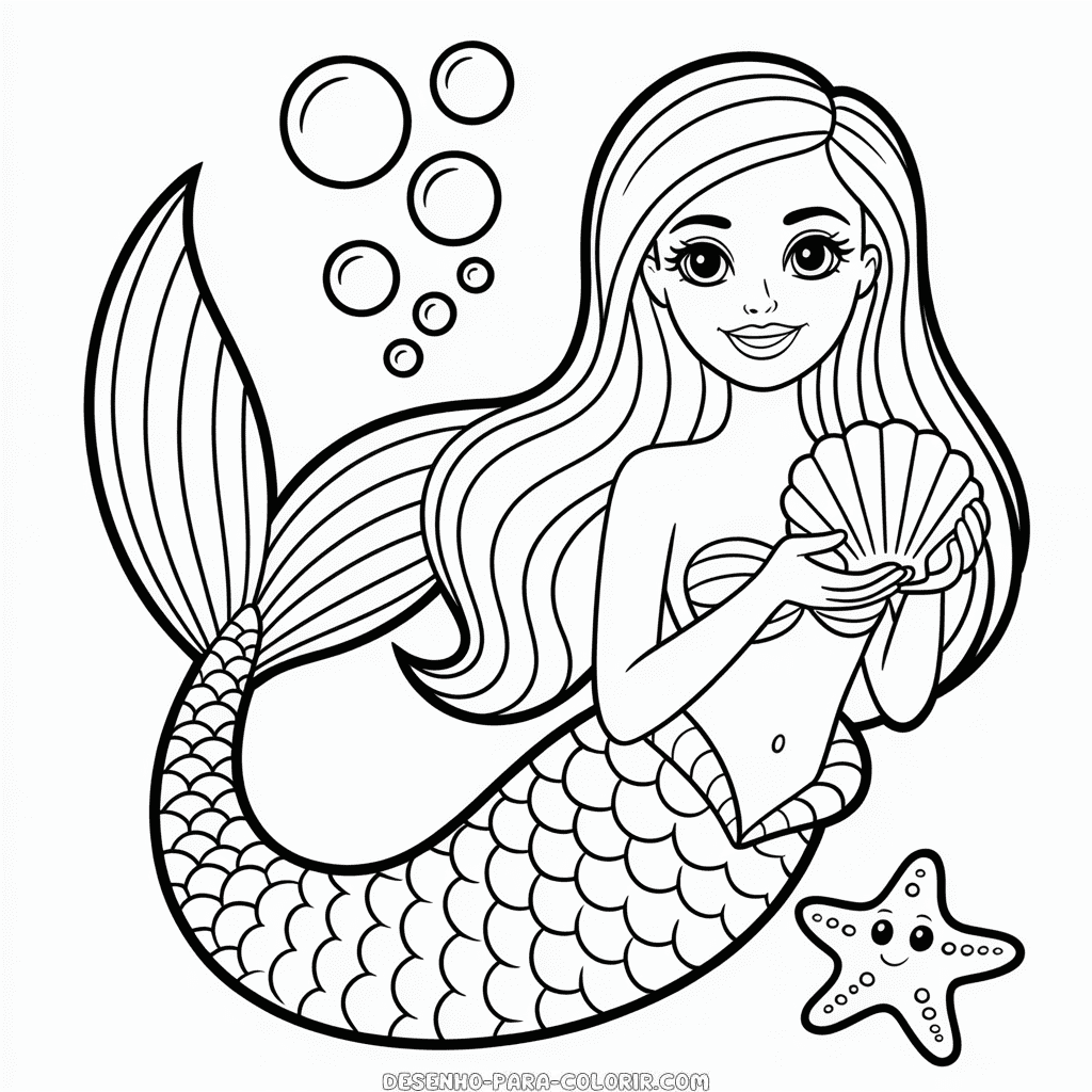 Desenho para colorir grátis de Barbie Sereia, uma imagem encantadora da Barbie em sua forma de sereia, pronta para explorar o oceano mágico. Imprima e colora esta ilustração da Barbie como sereia, ideal para crianças que adoram personagens famosos e temas de fantasia. Imagem PNG de alta qualidade, em preto e branco, otimizada para impressão em PDF formato A4.