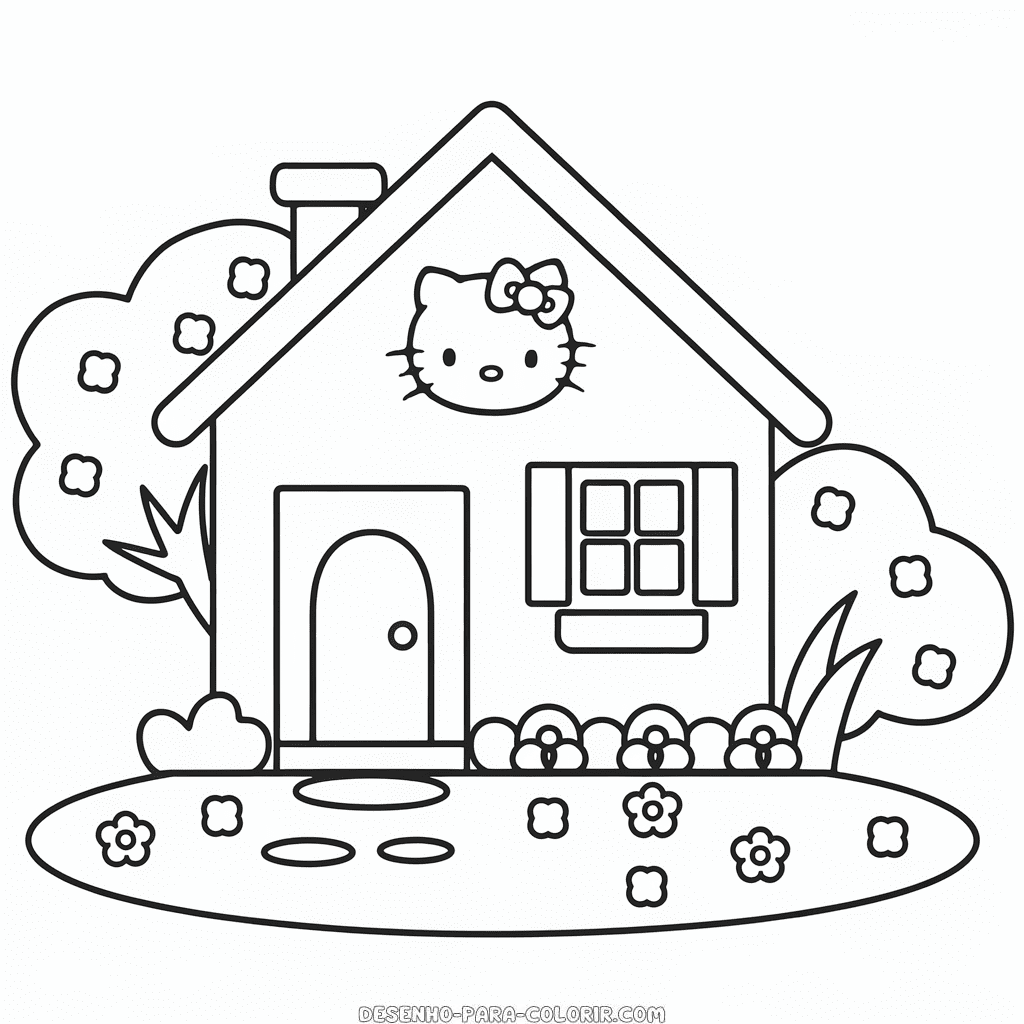 Desenho para colorir grátis da Casa da Hello Kitty, uma linda imagem da famosa casa da gatinha adorada por crianças de todo o mundo. Imprima e colora esta encantadora ilustração da casa da Hello Kitty, perfeita para quem é fã dessa personagem querida. Imagem PNG de alta qualidade, em preto e branco, otimizada para impressão em PDF formato A4.