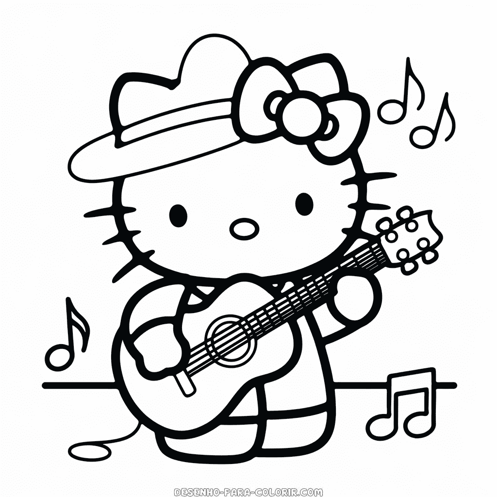Desenho para colorir grátis de Hello Kitty Música, mostrando a adorável Hello Kitty envolvida em uma divertida atividade musical. Imprima e colora esta encantadora ilustração de Hello Kitty desfrutando da música, perfeita para crianças que adoram a personagem. Imagem PNG de alta qualidade, em preto e branco, otimizada para impressão em PDF formato A4.