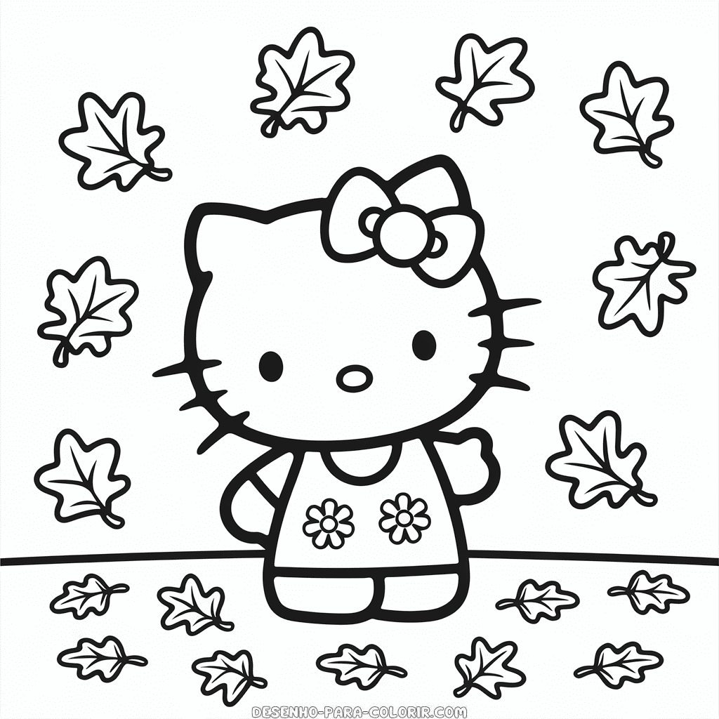 Desenho para colorir grátis de Hello Kitty no Outono, mostrando a adorável gatinha aproveitando a estação com folhas caindo ao seu redor. Imprima e colora esta ilustração de Hello Kitty em uma cena outonal para crianças. Imagem PNG de alta qualidade, em preto e branco, otimizada para impressão em PDF formato A4.