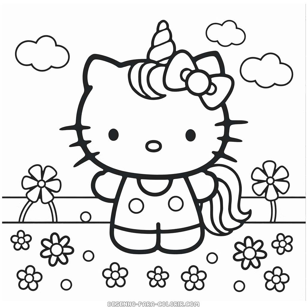 Desenho para colorir grátis de Hello Kitty Unicórnio, uma adorável cena onde a charmosa gatinha está ao lado de um mágico unicórnio. Imprima e colora esta encantadora ilustração da Hello Kitty como um unicórnio para diversão das crianças. Imagem PNG de alta qualidade, em preto e branco, otimizada para impressão em PDF formato A4.