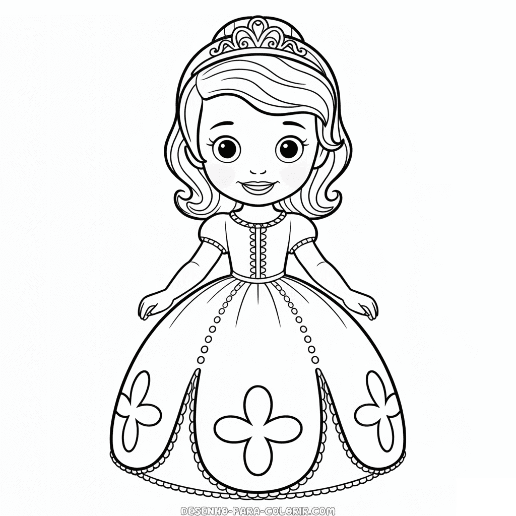 Desenho para colorir grátis de Princesa do Disney Junior, encantadora princesa do famoso canal infantil. Imprima e colora esta ilustração inspirada nas aventuras mágicas das princesas do Disney Junior para crianças. Imagem PNG de alta qualidade, em preto e branco, otimizada para impressão em PDF formato A4.