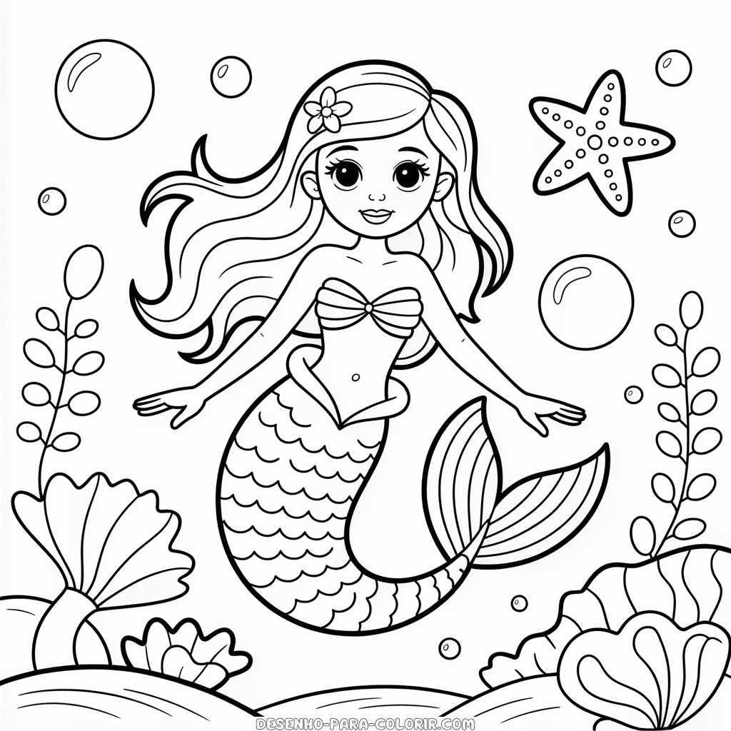 Desenho para colorir grátis de Sereia Bonita, uma linda sereia com cabelos longos e cauda cintilante, perfeita para colorir e se divertir. Imprima e colora esta ilustração de uma sereia encantadora para crianças que adoram o mundo mágico do mar. Imagem PNG de alta qualidade, em preto e branco, otimizada para impressão em PDF formato A4.