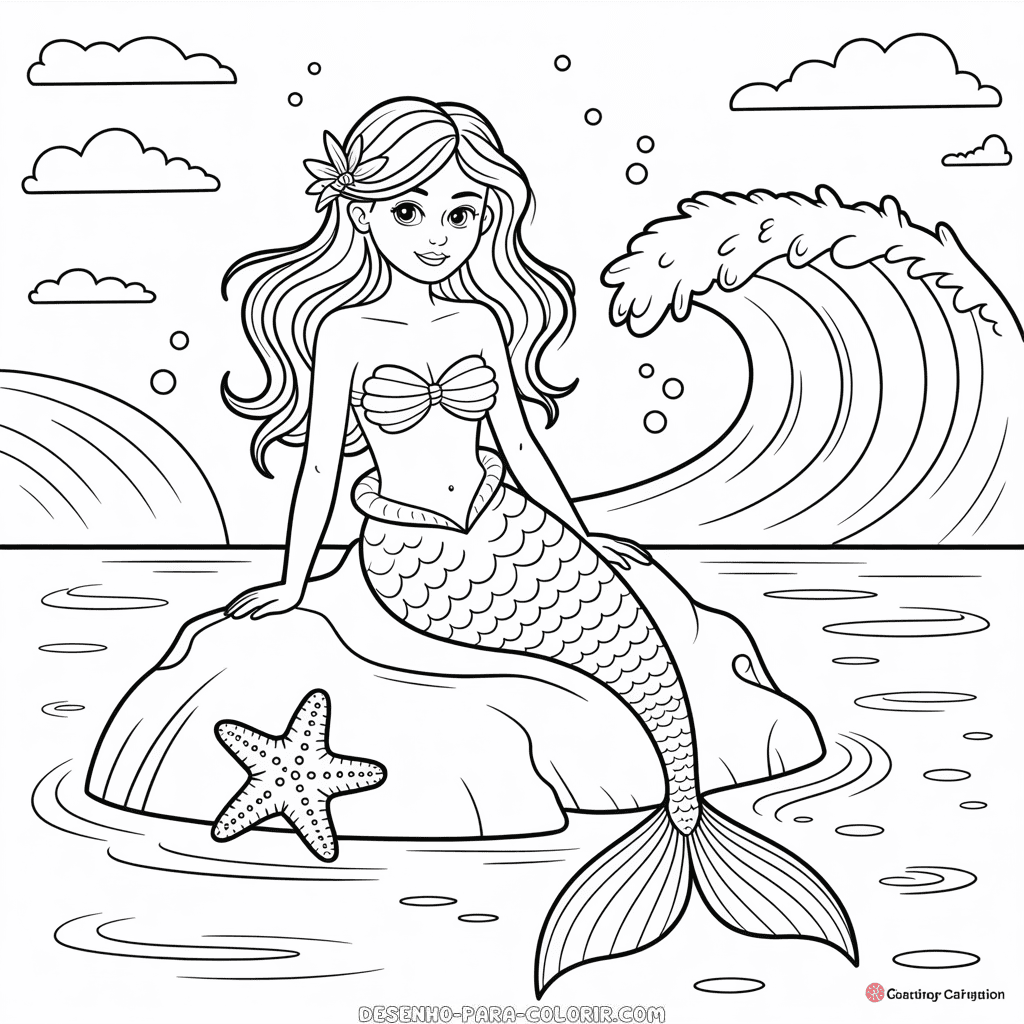Desenho para colorir grátis de Sereia, uma encantadora criatura do mar pronta para ganhar vida com cores vibrantes. Imprima e colora esta ilustração de uma sereia para crianças, perfeita para despertar a imaginação e explorar o mundo mágico do oceano. Imagem PNG de alta qualidade, em preto e branco, otimizada para impressão em PDF formato A4.
