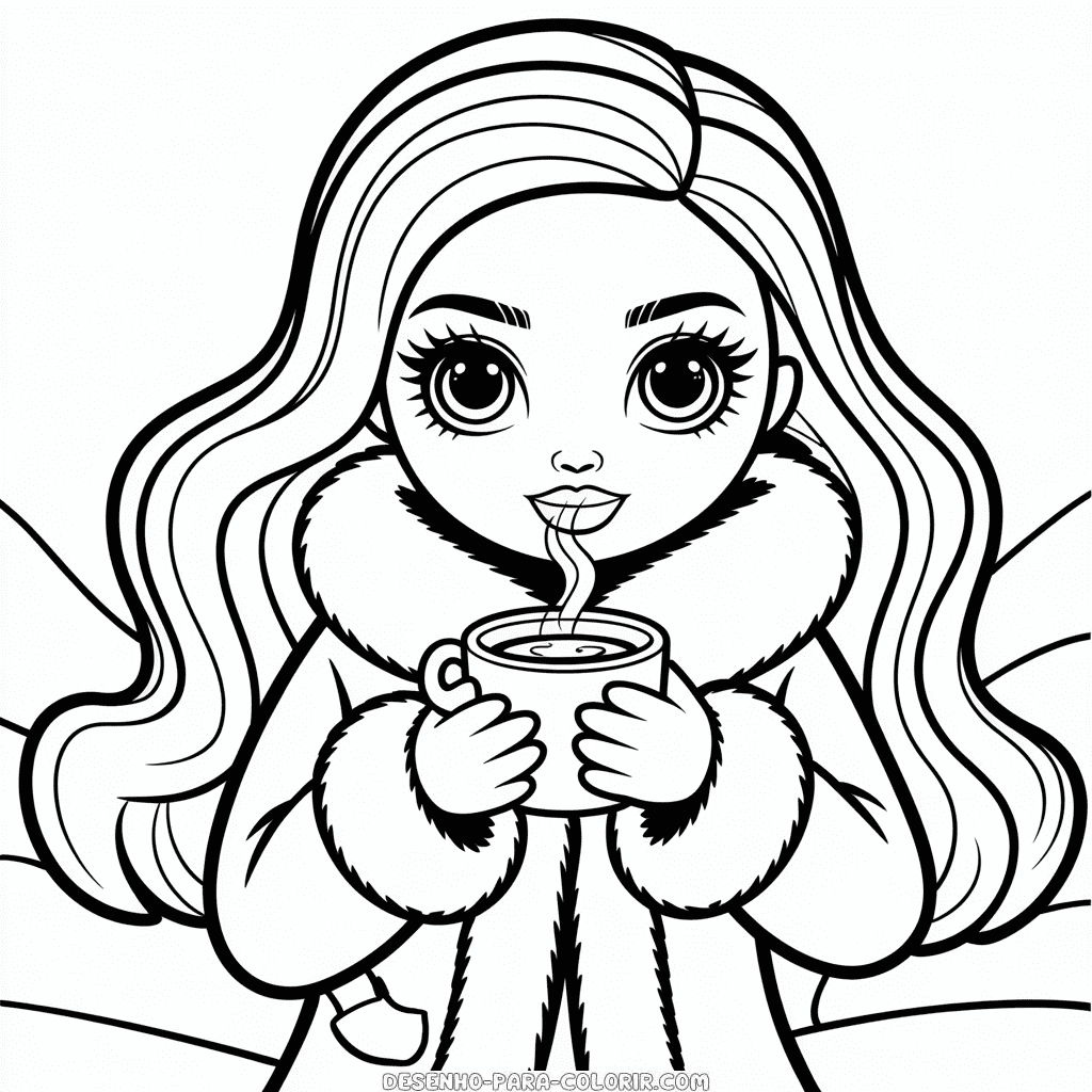 Desenho para colorir grátis das Bratz no Inverno, retratando suas aventuras cheias de estilo durante a estação fria. Imprima e colora esta ilustração das Bratz curtindo o Inverno, ideal para crianças. Imagem PNG de alta qualidade, em preto e branco, otimizada para impressão em PDF formato A4.