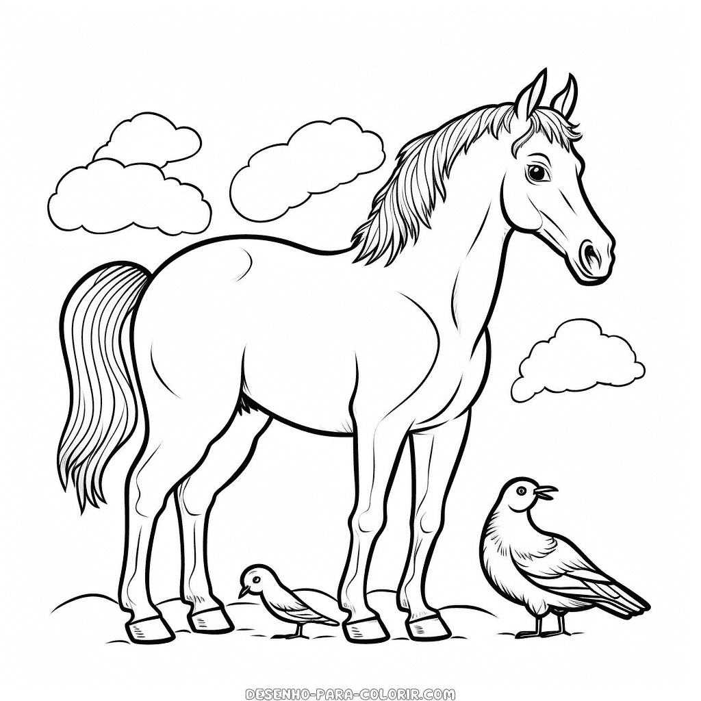 Este desenho para colorir conta com a presença de um cavalo e alguns pombos. É uma ótima oportunidade para introduzir esses animais às crianças enquanto elas se divertem colorindo.