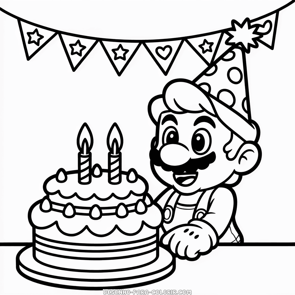 Desenho para colorir grátis de Aniversário Feliz do Mario, apresentando uma divertida cena de celebração com o famoso encanador de videogames Mario. Imprima e colora esta ilustração do Mario em uma festa de aniversário, perfeita para crianças que adoram o universo dos videogames. Imagem PNG de alta qualidade, em preto e branco, otimizada para impressão em PDF formato A4.