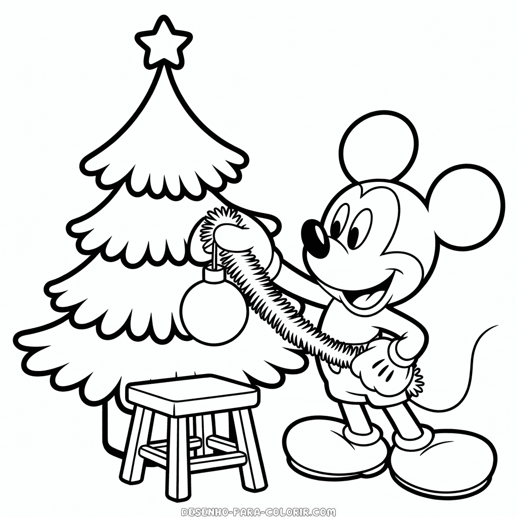 Desenho para colorir grátis de Árvore de Natal e Mickey Mouse, um divertido encontro entre o clássico personagem da Disney e uma linda árvore de Natal decorada. Imprima e colora esta ilustração natalina com o Mickey Mouse, perfeito para crianças se inspirarem no espírito das festas de final de ano. Imagem PNG de alta qualidade, em preto e branco, otimizada para impressão em PDF formato A4.