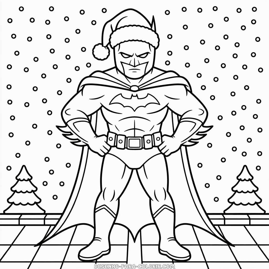 Desenho para colorir grátis de Batman Natalino, mostrando o famoso herói em clima de Natal. Imprima e colora esta ilustração festiva do Batman durante as celebrações natalinas, perfeita para crianças. Imagem PNG de alta qualidade, em preto e branco, otimizada para impressão em PDF formato A4.