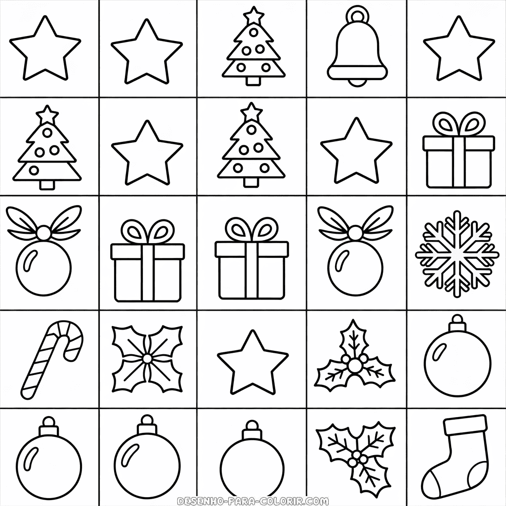 Desenho para colorir grátis de Bingo de Natal, mostrando um adorável cãozinho pronto para celebrar as festas junto à árvore natalina e presentes. Imprima e colora esta ilustração festiva do Bingo em clima de Natal ideal para crianças. Imagem PNG de alta qualidade, em preto e branco, otimizada para impressão em PDF formato A4.