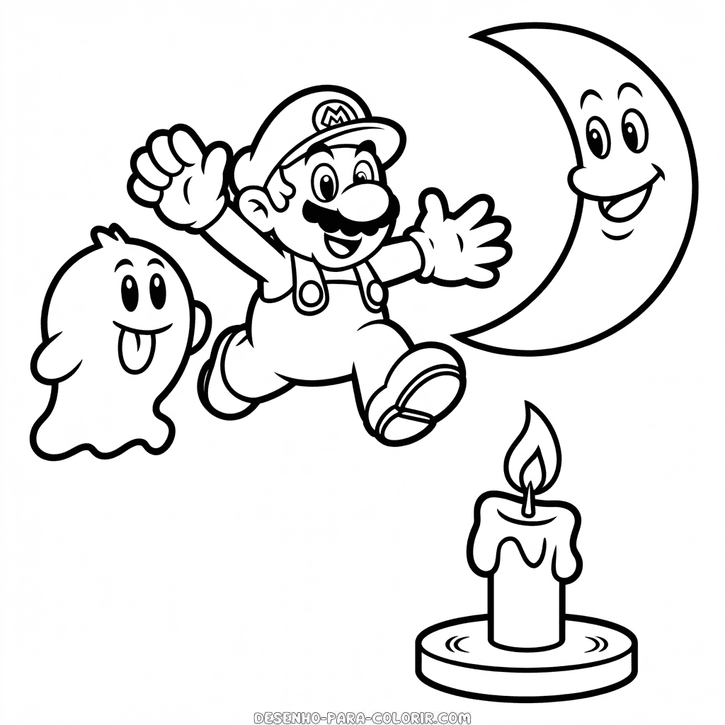 Desenho para colorir grátis de Boo Fantasma e Mario, divertido encontro entre o famoso herói de videogame Mario e o misterioso fantasma Boo. Imprima e colora esta ilustração com o aventureiro Mario e o intrigante Boo para crianças. Imagem PNG de alta qualidade, em preto e branco, otimizada para impressão em PDF formato A4.