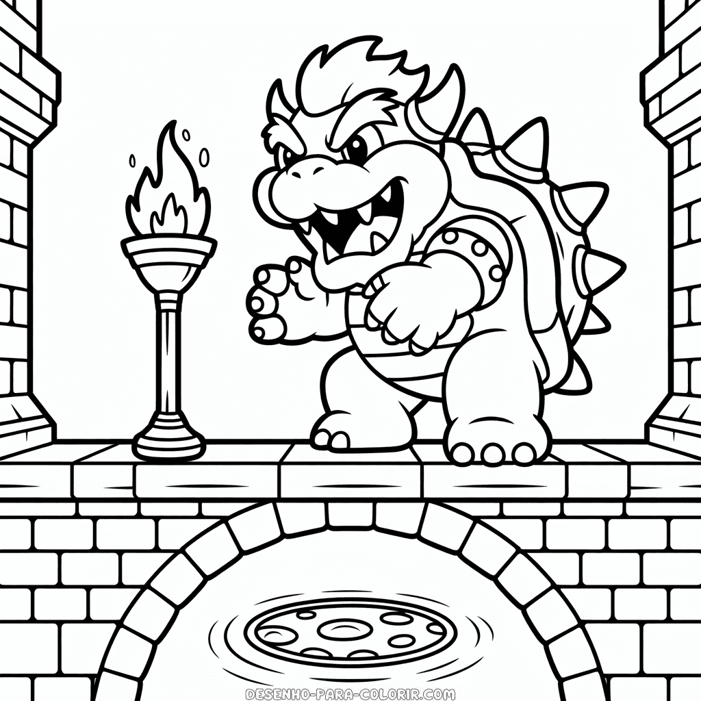 Desenho para colorir grátis de Bowser do Mario, o famoso vilão da série de jogos Mario conhecido por sua aparência imponente e desafios épicos. Imprima e colora esta poderosa figura de Bowser, o lendário antagonista do universo Mario, que promete ser um ótimo passatempo para as crianças. Imagem PNG de alta qualidade, em preto e branco, otimizada para impressão em PDF formato A4.
