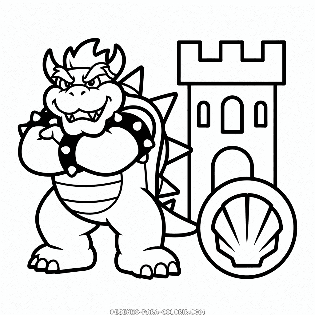 Desenho para colorir grátis de Bowser do Super Mario, uma imagem impressionante do famoso vilão dos jogos clássicos, perfeito para os pequenos fãs de videogame. Imprima e colora esta ilustração de Bowser, o poderoso antagonista de Super Mario, aventure-se no mundo dos cogumelos com esta figura especial. Imagem PNG de alta qualidade, em preto e branco, otimizada para impressão em PDF formato A4.