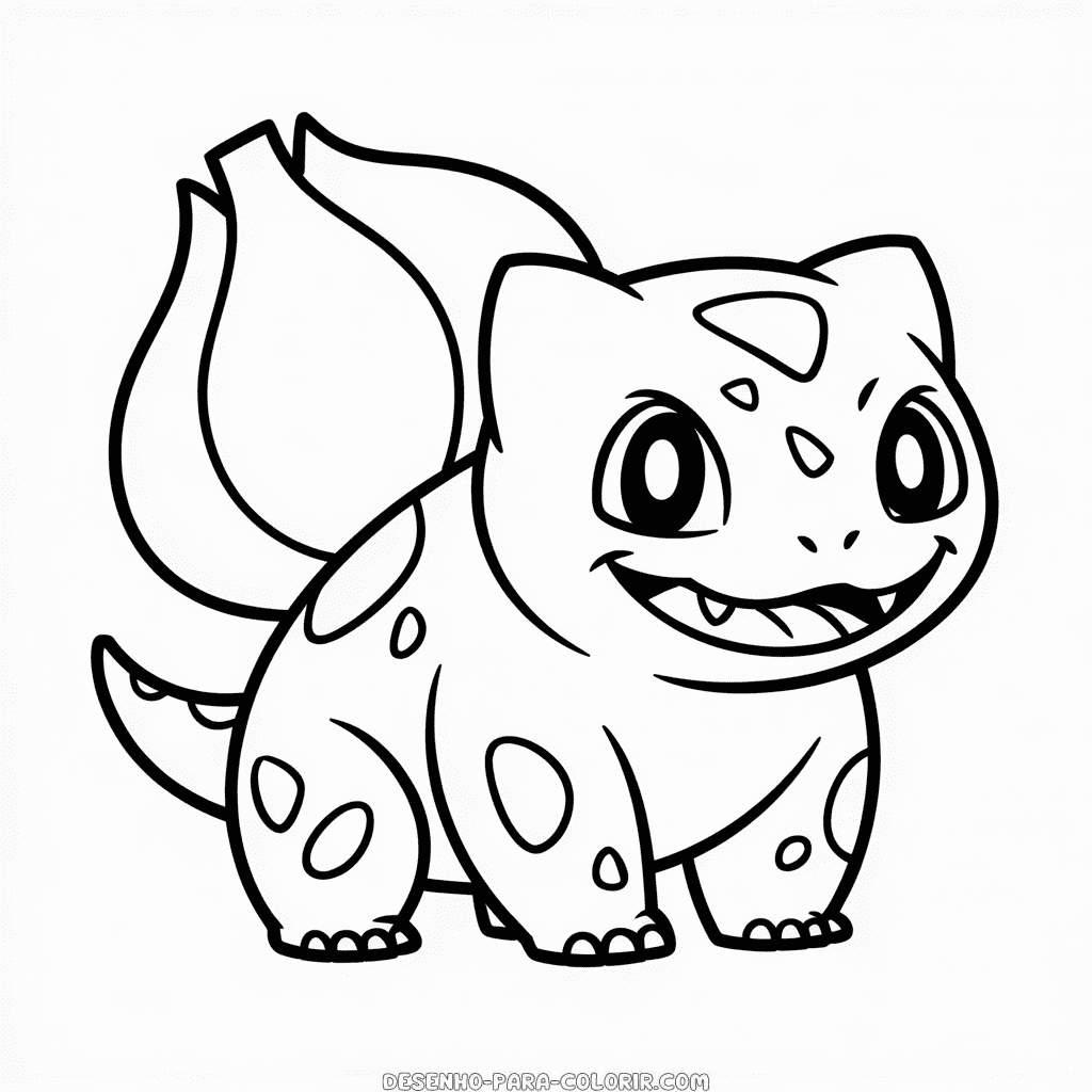 Desenho para colorir grátis do Bulbassauro dos desenhos animados, perfeito para os pequenos fãs deste adorável Pokémon. Imprima e colora esta ilustração do simpático Bulbassauro de sua série animada favorita. Imagem PNG de alta qualidade, em preto e branco, otimizada para impressão em PDF formato A4.