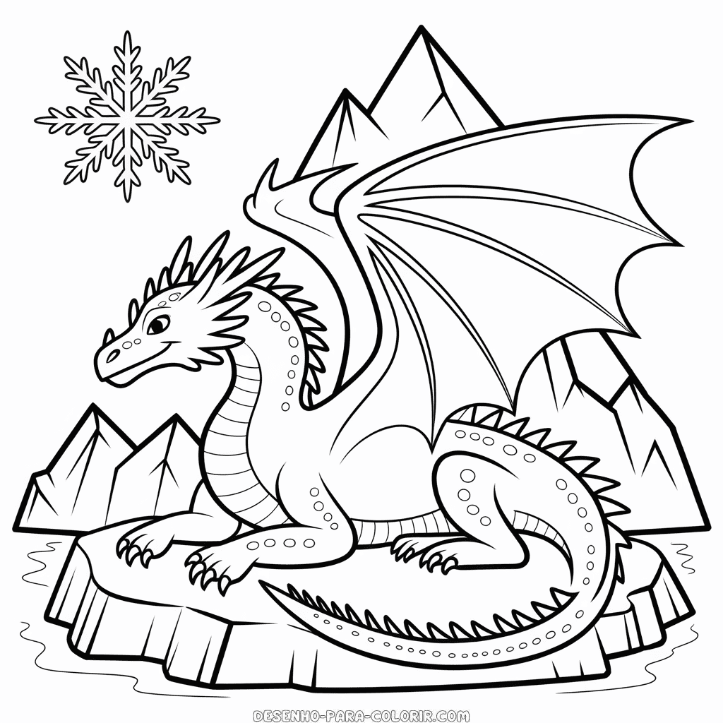 Desenho para colorir grátis de Dragão Ártico, uma criatura mítica que domina o frio e o gelo. Imprima e colora esta figura do majestoso Dragão do Ártico, perfeito para crianças aventureiras. Imagem PNG de alta qualidade, em preto e branco, otimizada para impressão em PDF formato A4.