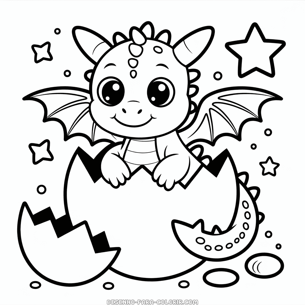 Desenho para colorir grátis de Dragão Bebê, uma encantadora imagem de um pequeno dragãozinho cheio de curiosidade. Imprima e colora esta ilustração de Dragão Bebê, perfeita para as crianças explorarem sua criatividade. Imagem PNG de alta qualidade, em preto e branco, otimizada para impressão em PDF formato A4.