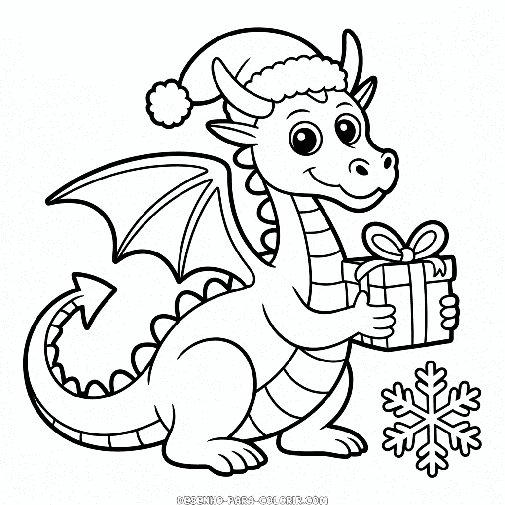 Desenho para colorir grátis de Dragão de Natal, uma figura encantadora de um dragão festivo pronto para celebrar a época natalina. Imprima e colora esta ilustração mágica do Dragão de Natal que traz um toque especial às tradições de fim de ano para crianças. Imagem PNG de alta qualidade, em preto e branco, otimizada para impressão em PDF formato A4.