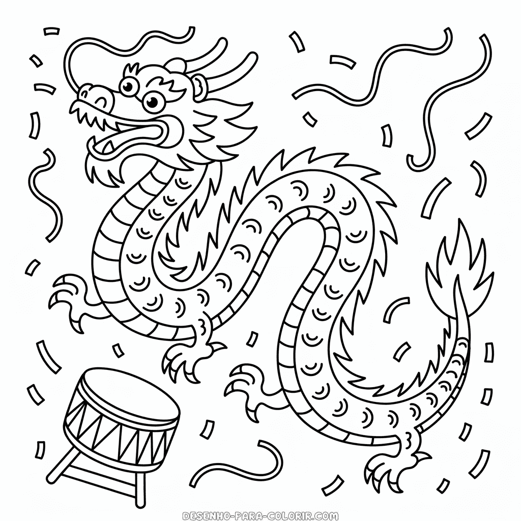 Desenho para colorir grátis do Dragão do Ano Novo Chinês, uma figura majestosa que simboliza sorte e prosperidade. Imprima e colora esta ilustração do Dragão Chinês típico das celebrações do Ano Novo, perfeita para crianças que adoram festividades culturais. Imagem PNG de alta qualidade, em preto e branco, otimizada para impressão em PDF formato A4.