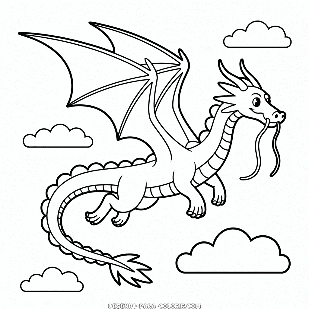 Desenho para colorir grátis do Dragão no Ar, imagem de um poderoso dragão voando majestosamente. Imprima e colora esta figura do dragão nos céus, uma aventura incrível para crianças. Imagem PNG de alta qualidade, em preto e branco, otimizada para impressão em PDF formato A4.