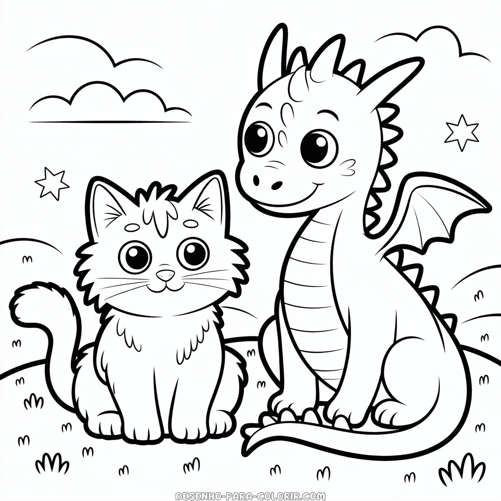 Desenho para colorir grátis de Gato e Dragão, apresentando uma cena amigável entre um gato curioso e um dragão majestoso num ambiente fantástico. Imprima e colora este encontro encantador entre estas duas criaturas mágicas que despertam a imaginação das crianças. Imagem PNG de alta qualidade, em preto e branco, otimizada para impressão em PDF formato A4.