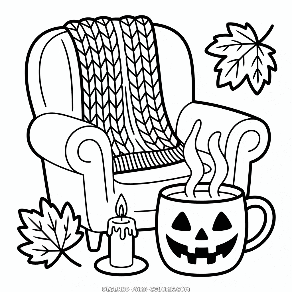 Desenho para colorir grátis de Halloween Aconchegante, uma cena fofa de Halloween que traz o clima acolhedor e divertido da festa. Imprima e colora esta ilustração aconchegante de Halloween, perfeita para as crianças. Imagem PNG de alta qualidade, em preto e branco, otimizada para impressão em PDF formato A4.