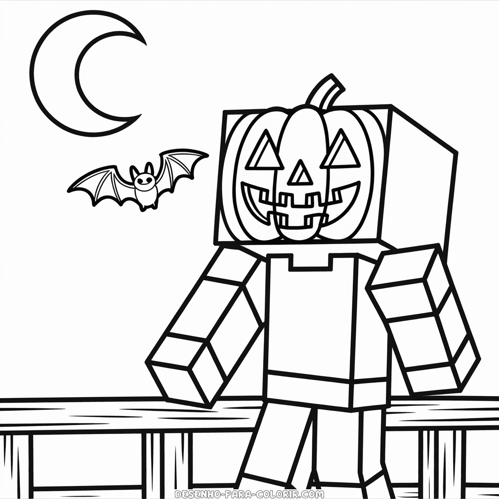 Desenho para colorir grátis de Halloween Minecraft, uma divertida combinação do universo Minecraft com o tema de Halloween. Imprima e colora esta ilustração de Halloween no Minecraft, ideal para crianças que adoram misturar sustos e blocos. Imagem PNG de alta qualidade, em preto e branco, otimizada para impressão em PDF formato A4.
