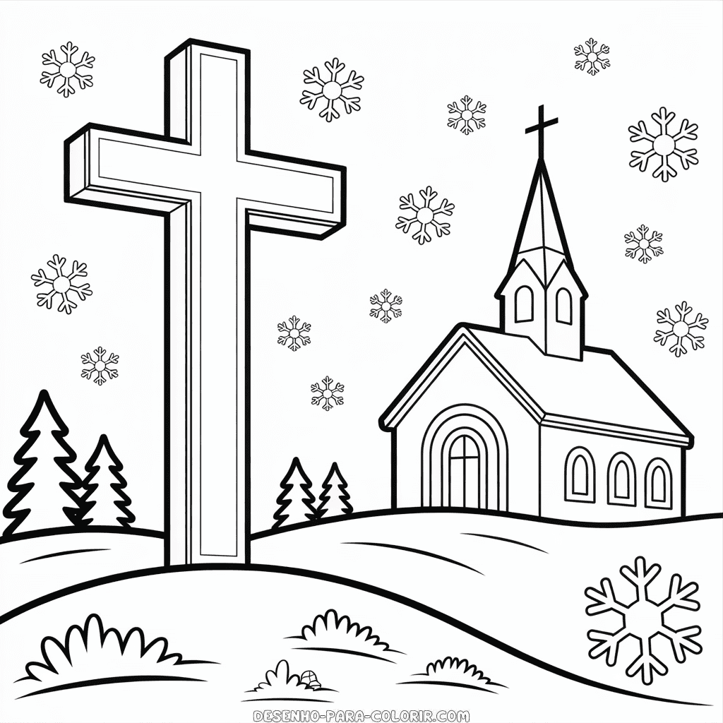 Desenho para colorir grátis de Inverno Cristão, ilustrando uma bela cena de inverno com símbolos cristãos. Imprima e colora esta imagem de inverno cristão para crianças, perfeita para explorar temas religiosos durante a estação fria. Imagem PNG de alta qualidade, em preto e branco, otimizada para impressão em PDF formato A4.