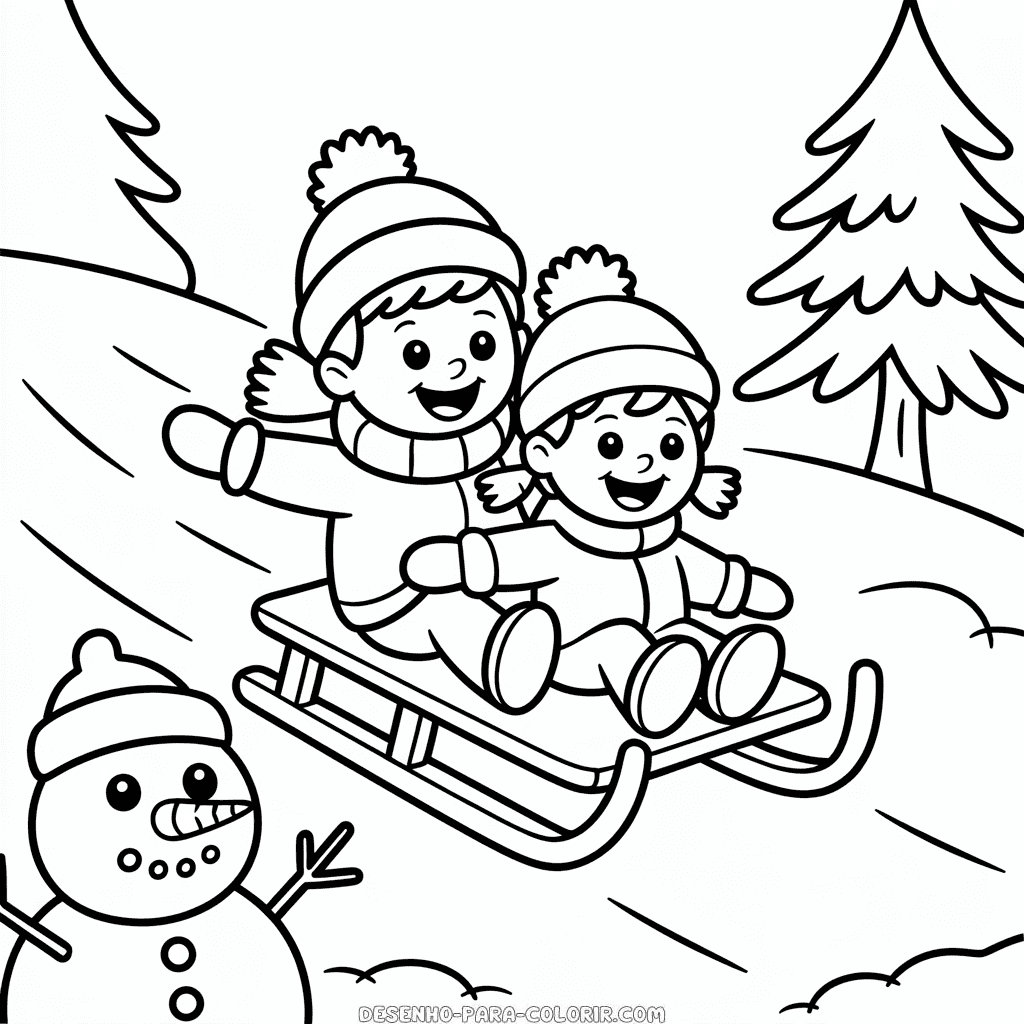 Desenho para colorir grátis de Inverno Infantil, uma cena encantadora que captura a magia da estação para os pequenos se divertirem. Imprima e colora esta ilustração temática do inverno para crianças. Imagem PNG de alta qualidade, em preto e branco, otimizada para impressão em PDF formato A4.