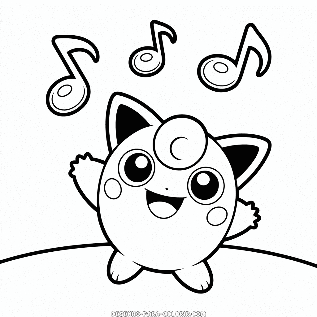 Desenho para colorir grátis de Jigglypuff, o adorável personagem redondo e musical de Pokémon. Imprima e colora este divertido personagem de Pokémon para crianças. Imagem PNG de alta qualidade, em preto e branco, otimizada para impressão em PDF formato A4.