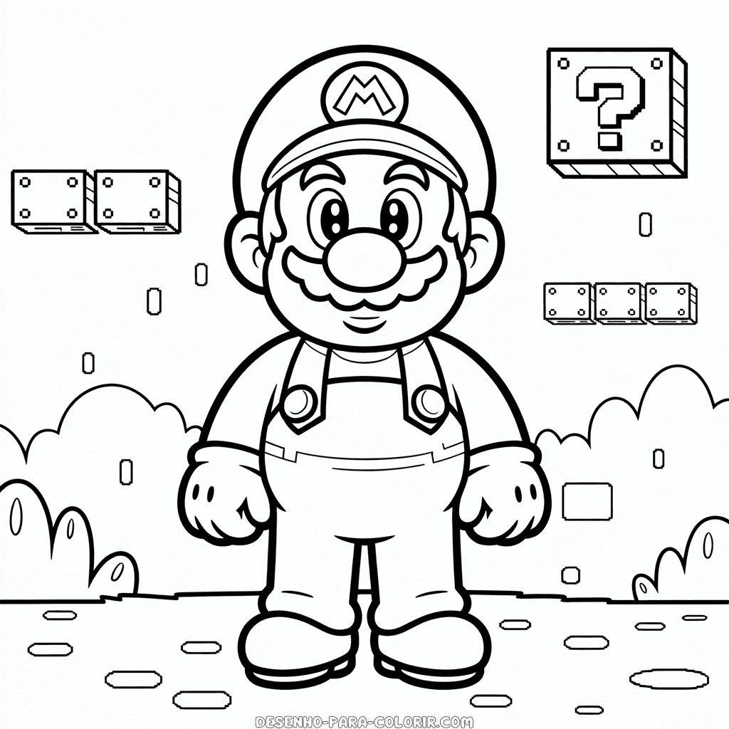 Desenho para colorir grátis do Jogo do Mario, destacando o famoso personagem com seu icônico chapéu vermelho e bigode. Imprima e colora esta imagem do mundo incrível do Mario para crianças. Imagem PNG de alta qualidade, em preto e branco, otimizada para impressão em PDF formato A4.