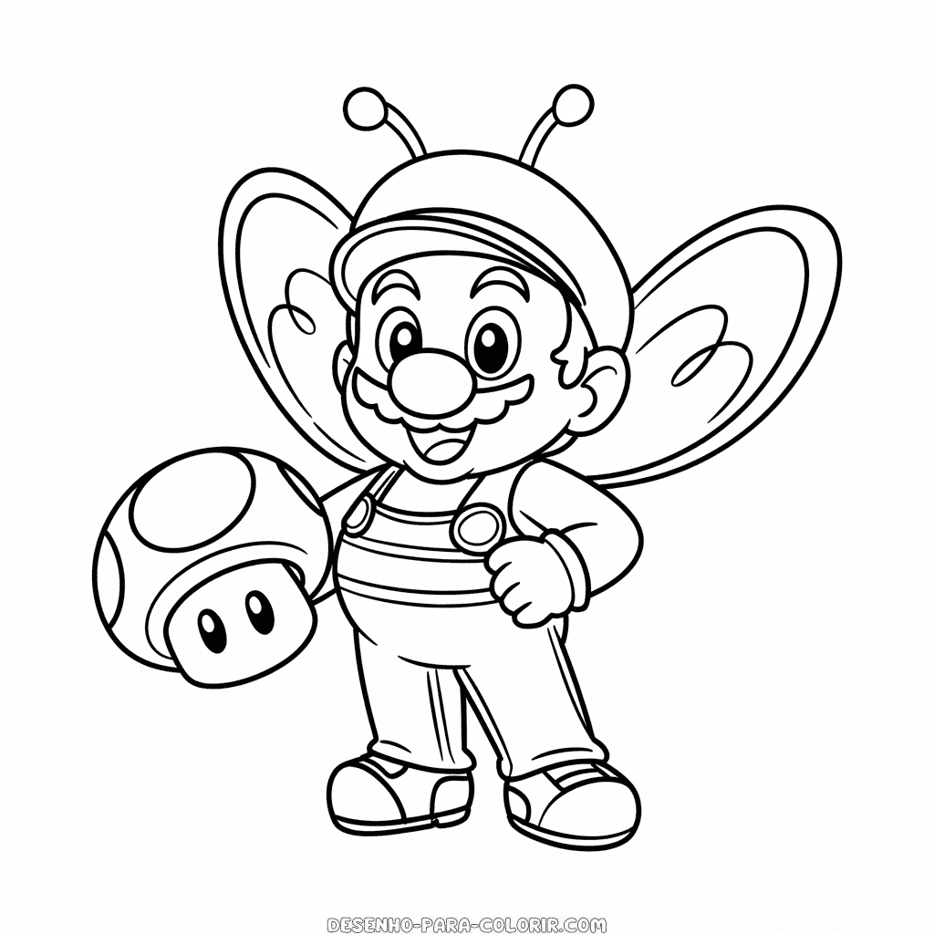 Desenho para colorir grátis de Mario com asas, destacando o famoso encanador em uma pose divertida e mágica. Imprima e colora esta ilustração encantadora do Mario com suas asas, perfeita para estimular a imaginação das crianças. Imagem PNG de alta qualidade, em preto e branco, otimizada para impressão em PDF formato A4.