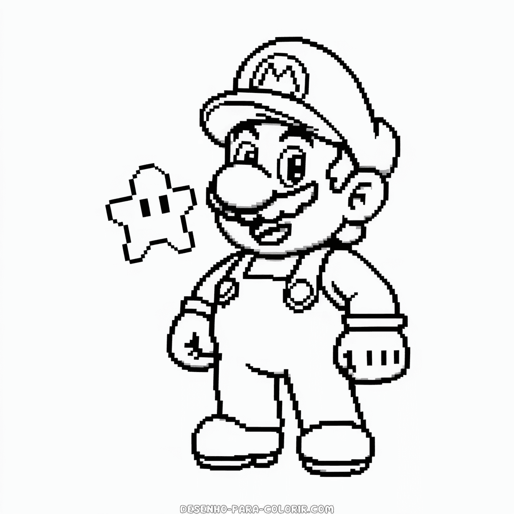 Desenho para colorir grátis de Mario Pixel, apresentando o herói icônico em estilo pixel art, perfeito para os fãs de videogames. Imprima e colora esta ilustração de Mario em estilo pixel para crianças, garantindo diversão e criatividade. Imagem PNG de alta qualidade, em preto e branco, otimizada para impressão em PDF formato A4.