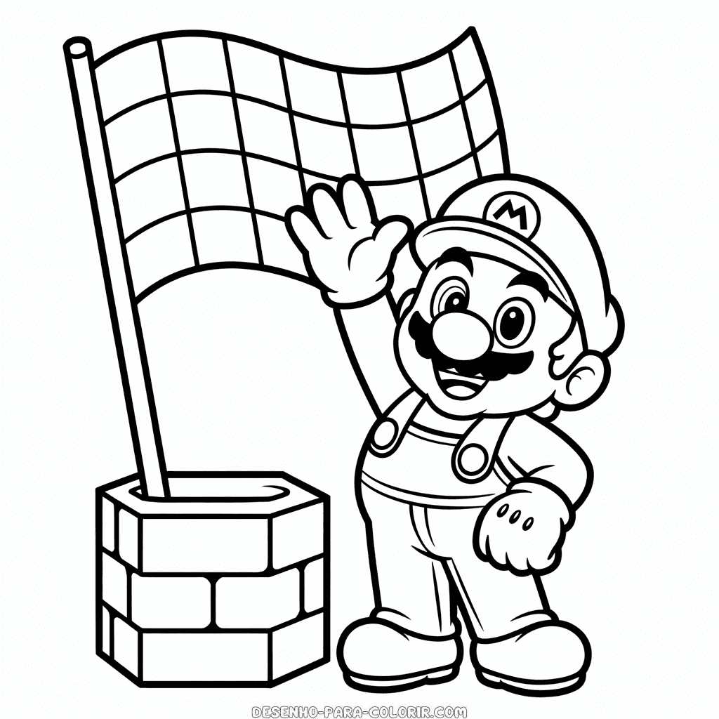 Desenho para colorir grátis de Mario preto e branco, apresentando o famoso encanador bigodudo em uma pose clássica. Imprima e colora esta ilustração do personagem Mario, amado por crianças e adultos em todo o mundo. Imagem PNG de alta qualidade, em preto e branco, otimizada para impressão em PDF formato A4.