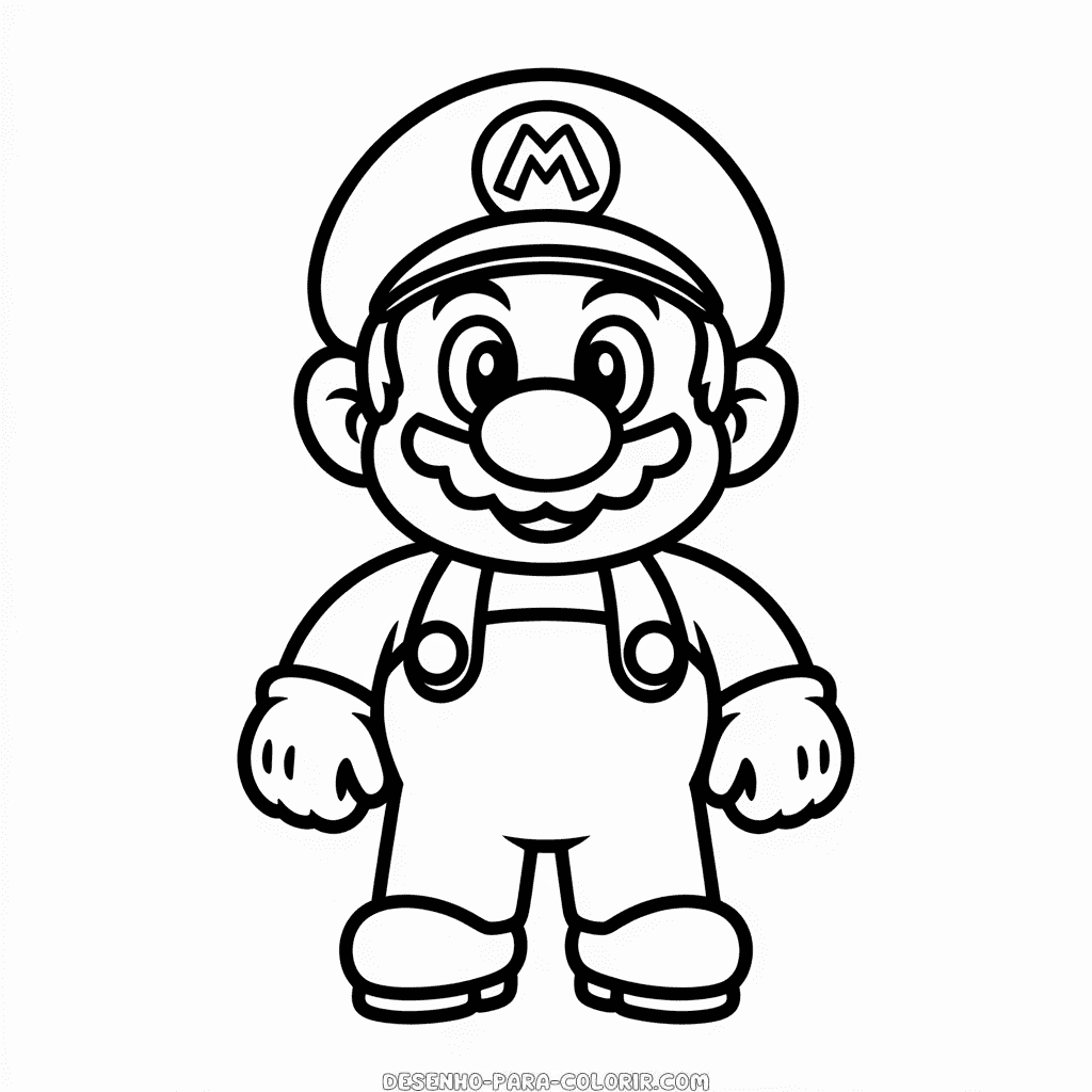 Desenho para colorir grátis do Mario Simples, uma figura amigável e fácil do famoso encanador dos videogames que as crianças adoram. Imprima e colora esta ilustração do personagem icônico Mario, perfeito para pequenos fãs de jogos e aventuras. Imagem PNG de alta qualidade, em preto e branco, otimizada para impressão em PDF formato A4.