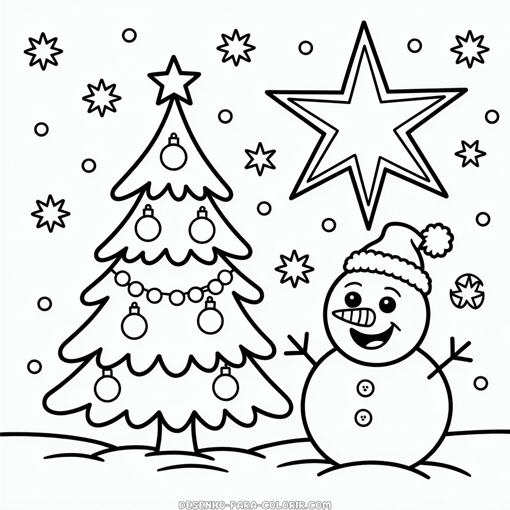 Desenho para colorir grátis de Natal e Inverno, capture a magia festiva da época com cenários de neve e decorações natalinas. Imprima e colora esta ilustração de festas de fim de ano e cenas invernais para crianças. Imagem PNG de alta qualidade, em preto e branco, otimizada para impressão em PDF formato A4.