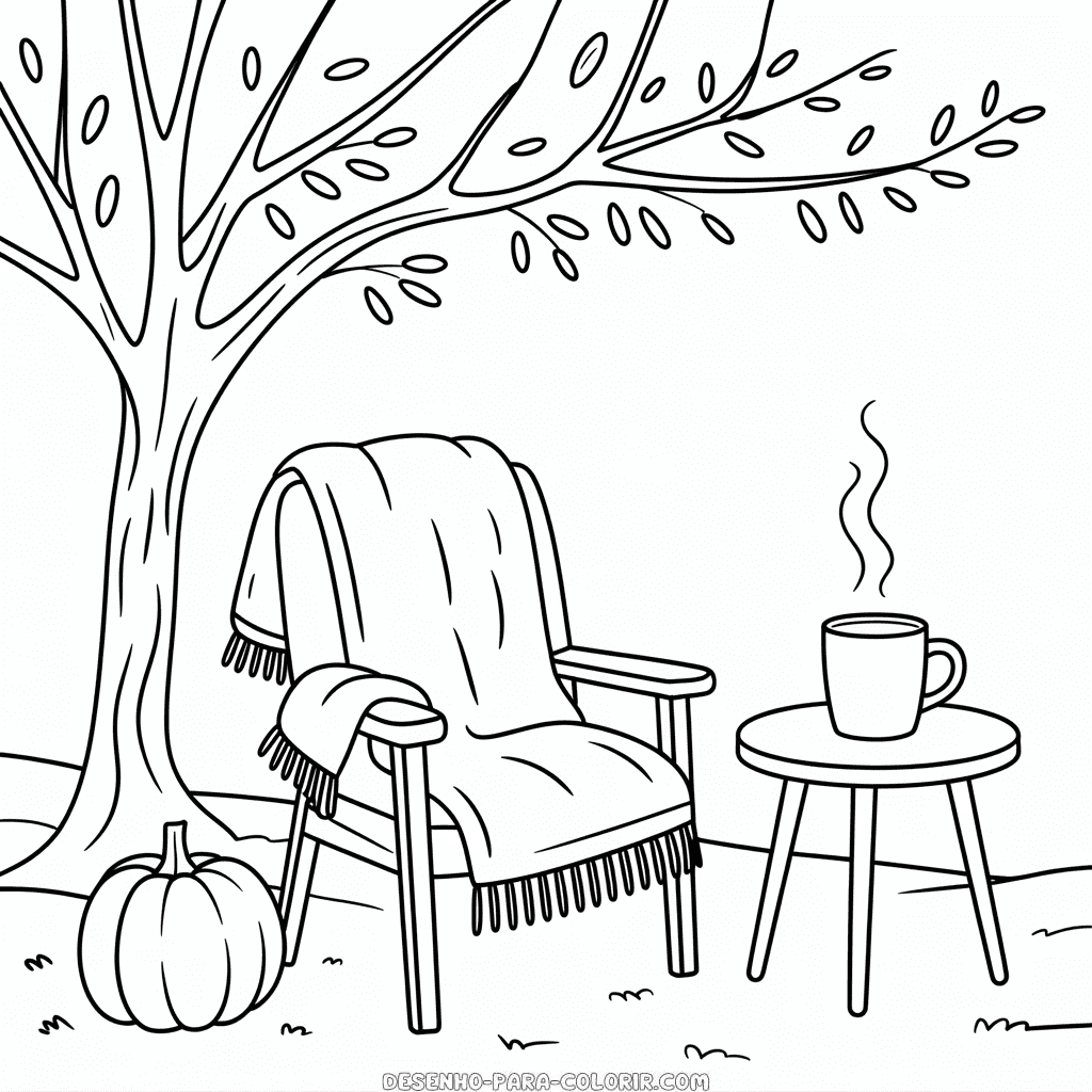 Desenho para colorir grátis de Outono Aconchegante, retratando uma cena acolhedora e típica da estação com folhas caídas e paisagens outonais. Imprima e colora esta ilustração de outono em um ambiente aconchegante, perfeita para crianças apreciarem a transformação da natureza. Imagem PNG de alta qualidade, em preto e branco, otimizada para impressão em PDF formato A4.