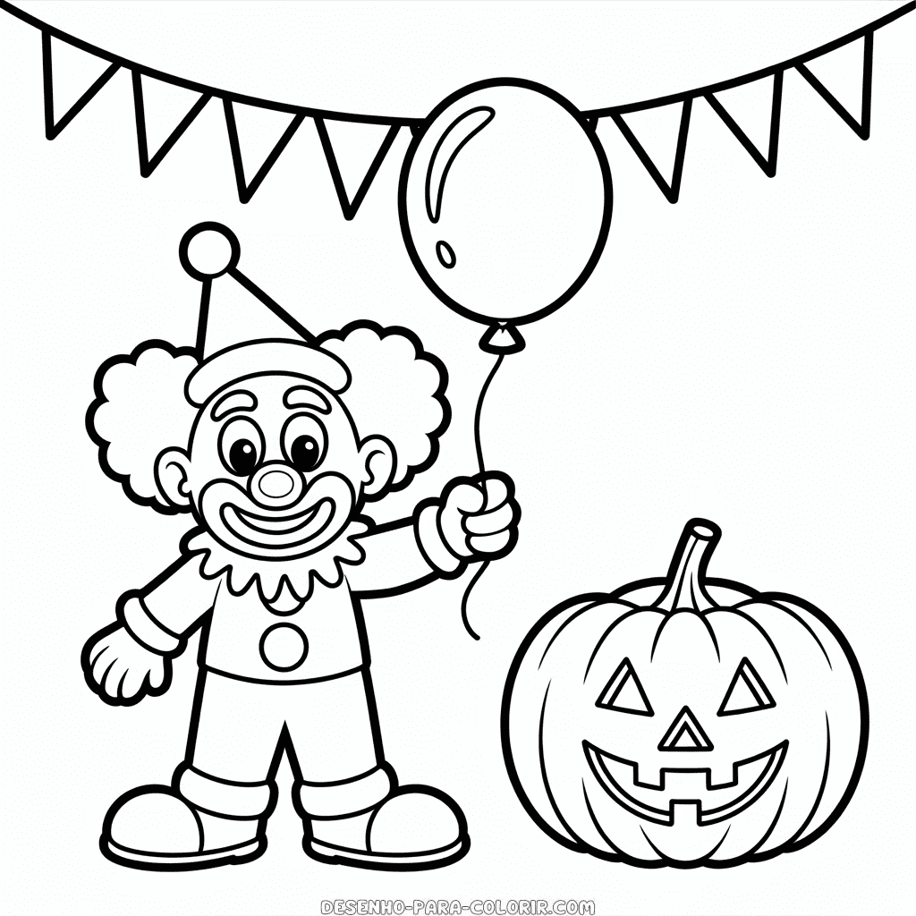 Desenho para colorir grátis de Palhaço do Halloween, o palhaço temático adorado pelas crianças que elas podem colorir nesta temporada de sustos. Imprima e colora esta ilustração do Palhaço do Dia das Bruxas repleta de detalhes divertidos e misteriosos para crianças. Imagem PNG de alta qualidade, em preto e branco, otimizada para impressão em PDF formato A4.