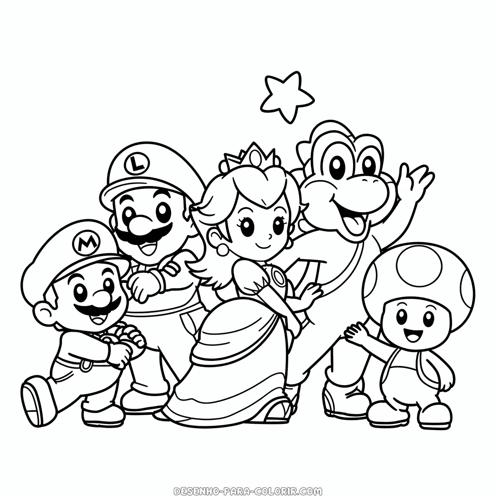 Desenho para colorir grátis de Personagens do Mario, trazendo a divertida turma do famoso jogo de videogame, sempre pronta para novas aventuras. Imprima e colora esta ilustração do mundo encantado do Mario e seus amigos para crianças. Imagem PNG de alta qualidade, em preto e branco, otimizada para impressão em PDF formato A4.