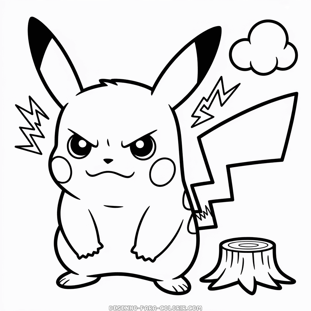 Desenho para colorir grátis de Pikachu Bravo, mostrando o famoso personagem Pokémon com expressão de determinação. Imprima e colora esta ilustração de Pikachu em modo feroz para crianças que adoram Pokémon. Imagem PNG de alta qualidade, em preto e branco, otimizada para impressão em PDF formato A4.