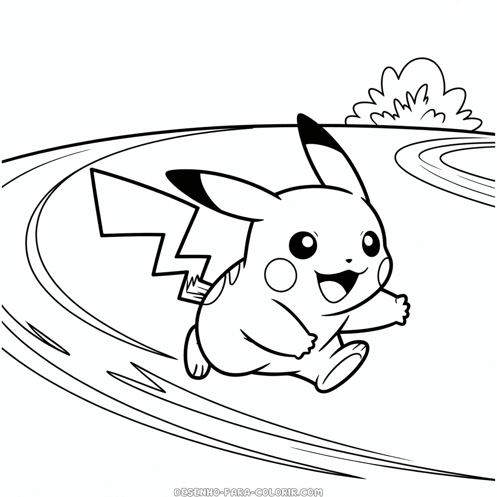 Desenho para colorir grátis de Pikachu Correndo, mostrando o famoso Pokémon em movimento rápido. Imprima e colora esta figura dinâmica de Pikachu em corrida para crianças. Imagem PNG de alta qualidade, em preto e branco, otimizada para impressão em PDF formato A4.