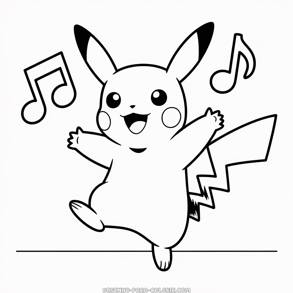 Desenho para colorir grátis de Pikachu Dançando, Pikachu alegremente em movimento com suas famosas bochechas elétricas. Imprima e colora esta imagem do personagem Pikachu em uma dança divertida para crianças. Imagem PNG de alta qualidade, em preto e branco, otimizada para impressão em PDF formato A4.