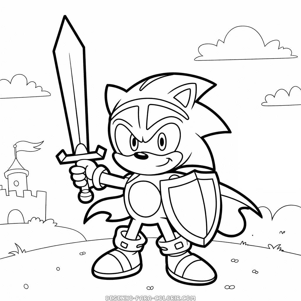 Desenho para colorir grátis de Sonic Cavaleiro, mostrando o famoso personagem Sonic vestido como um nobre cavaleiro pronto para novas aventuras. Imprima e colora esta ilustração do Sonic como cavaleiro para crianças. Imagem PNG de alta qualidade, em preto e branco, otimizada para impressão em PDF formato A4.