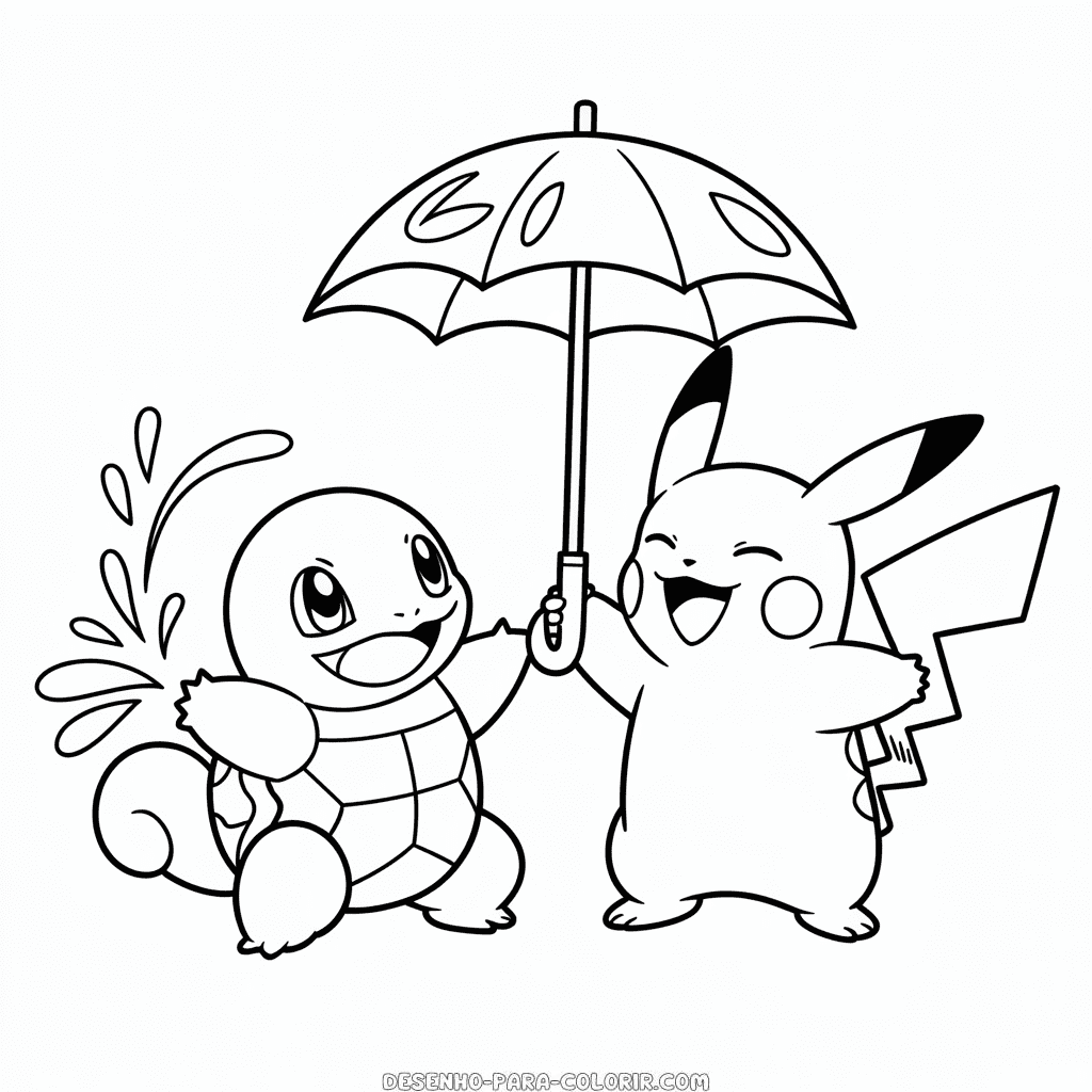 Desenho para colorir grátis de Squirtle e Pikachu, dois dos personagens mais queridos do universo Pokémon prontos para ganhar vida com suas cores favoritas. Imprima e colora esta ilustração de Pikachu e Squirtle, ideal para crianças que adoram aventuras Pokémon. Imagem PNG de alta qualidade, em preto e branco, otimizada para impressão em PDF formato A4.