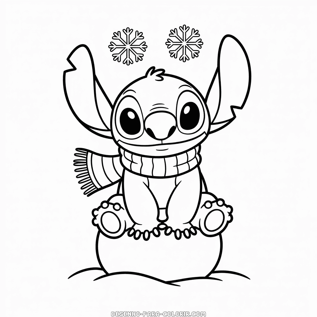 Desenho para colorir grátis de Stitch invernal, capturando o adorável personagem Stitch em um ambiente frio e aconchegante. Imprima e colora esta figura do Stitch em seu tema invernal, ideal para entreter as crianças durante os dias mais frios. Imagem PNG de alta qualidade, em preto e branco, otimizada para impressão em PDF formato A4.