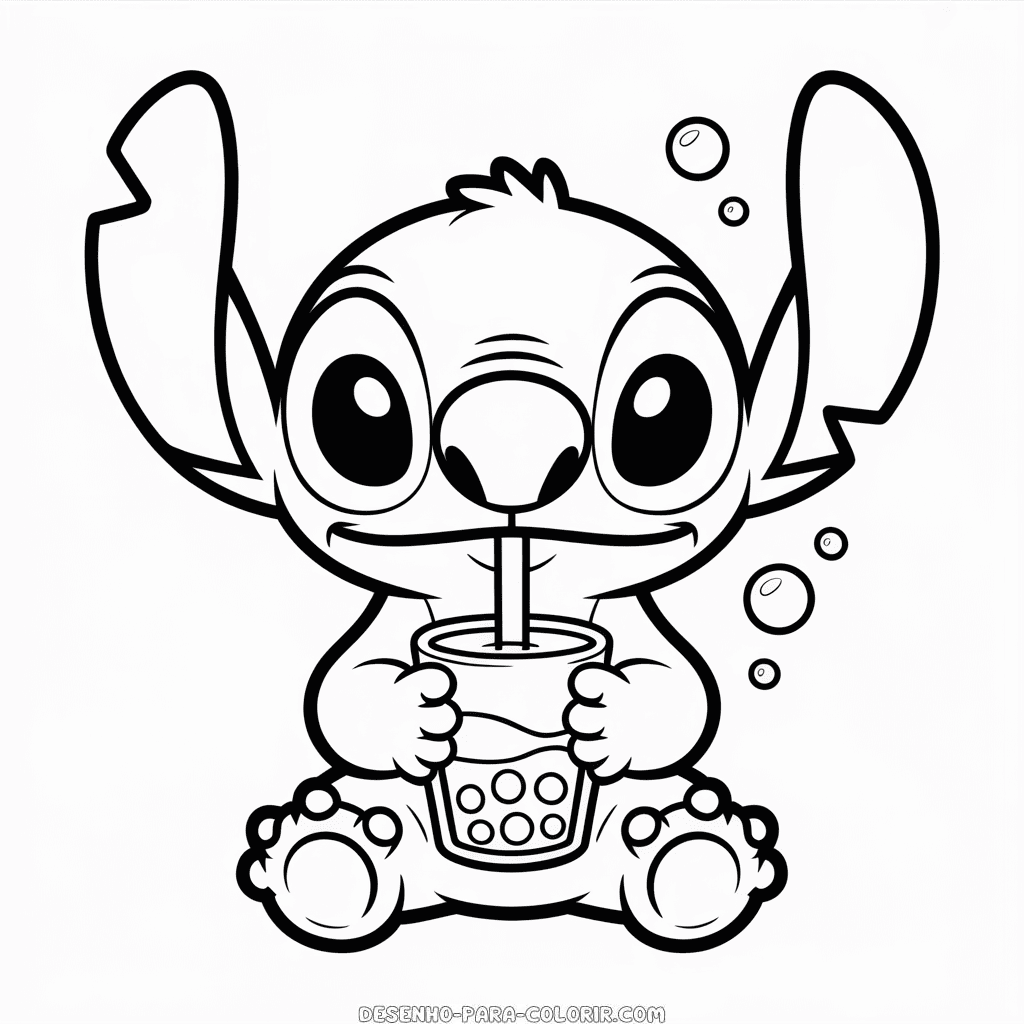 Desenho para colorir grátis de Stitch segurando boba, mostrando o adorável personagem de Disney enquanto aprecia sua bebida favorita. Imprima e colora esta ilustração de Stitch com copo de boba, perfeita para entreter as crianças com cores vibrantes. Imagem PNG de alta qualidade, em preto e branco, otimizada para impressão em PDF formato A4.