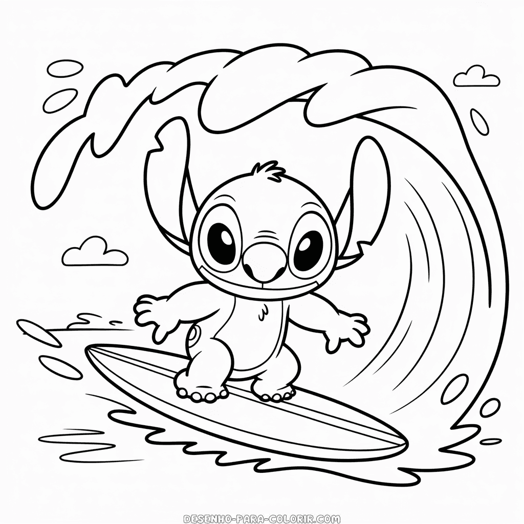 Desenho para colorir grátis de Stitch surfando, mostrando o famoso personagem da Disney se divertindo sobre uma prancha de surfe. Imprima e colora esta ilustração do Stitch se aventurando no mar para crianças. Imagem PNG de alta qualidade, em preto e branco, otimizada para impressão em PDF formato A4.